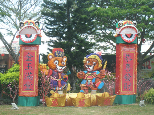 门口处的保安站会交一张通行证给你,要你随身携带,这项措施的目的是为了防止车子被偷窃而设。通过了保安站,就看到为虎年而设的老虎肖像装饰,充满新年气息。