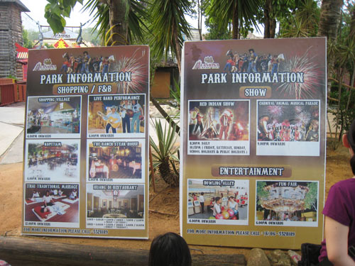 很快的手机闹钟就响起来了,时间到了!洗把脸我们就步行去不远处的西部牛仔城,其实有Shuttle Bus服务的,只是我们觉得走走也无妨,那时候是怀着一颗兴奋的心情前往的。来到了售票处,才被他们的收费价格给吓了一下,两个人就要RM130了,虽然包括了两客西餐和4D电影入场卷,但还是觉得挺贵的。门口处放着两个海报,介绍着Cowboy Town里的节目和游乐设施,包括游乐园,餐厅,节目表演时间表等等。