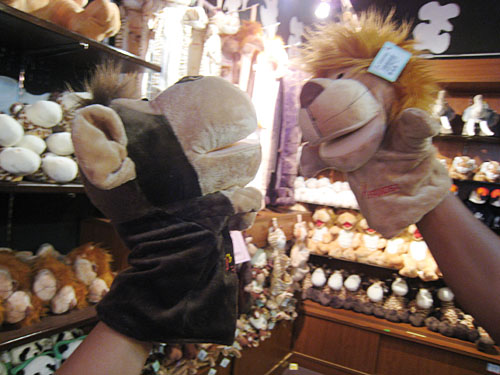 来到Shopping Village这个专卖精品的购物村,就看到琳琅满目却价格不菲的精品礼物,但是为了纪念我们的到此一游,我还是买了一个冰箱吸铁(RM19.90)作为纪念。玩具店里大部分都是动物造型的毛公仔,看到这两个手套公仔,我们就开始自编自演了,一只手拿相机,另一只手操控毛公仔可不容易哦!