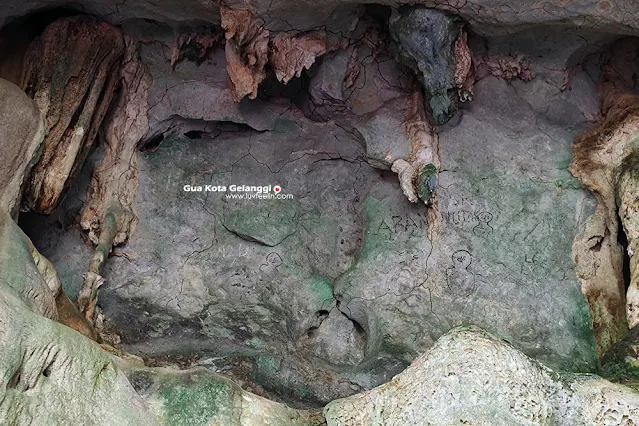这原本就冷门的地方,加上斋戒月期间更是人烟罕至,因此过程中一直被凶猛的蚊子追杀。我们沿着小溪前进,很快地就来到了一个大山洞,只见洞顶有着各种坑洞,看起来就像巨大的猛兽足印,又或是个人想象里丰富下的任何形态。周围的壁上都是各种涂鸦,年份甚至回到几十年前。看着陡峭的洞壁,真好奇他们是如何在上面“留言”的呢?